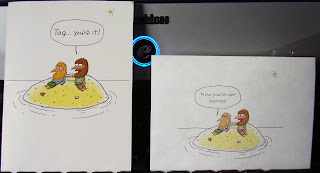 My girlfriend sent me a cute card the other day. I Photoshopped it and sent back my own version. Here's a photo of both cards side-by-side.